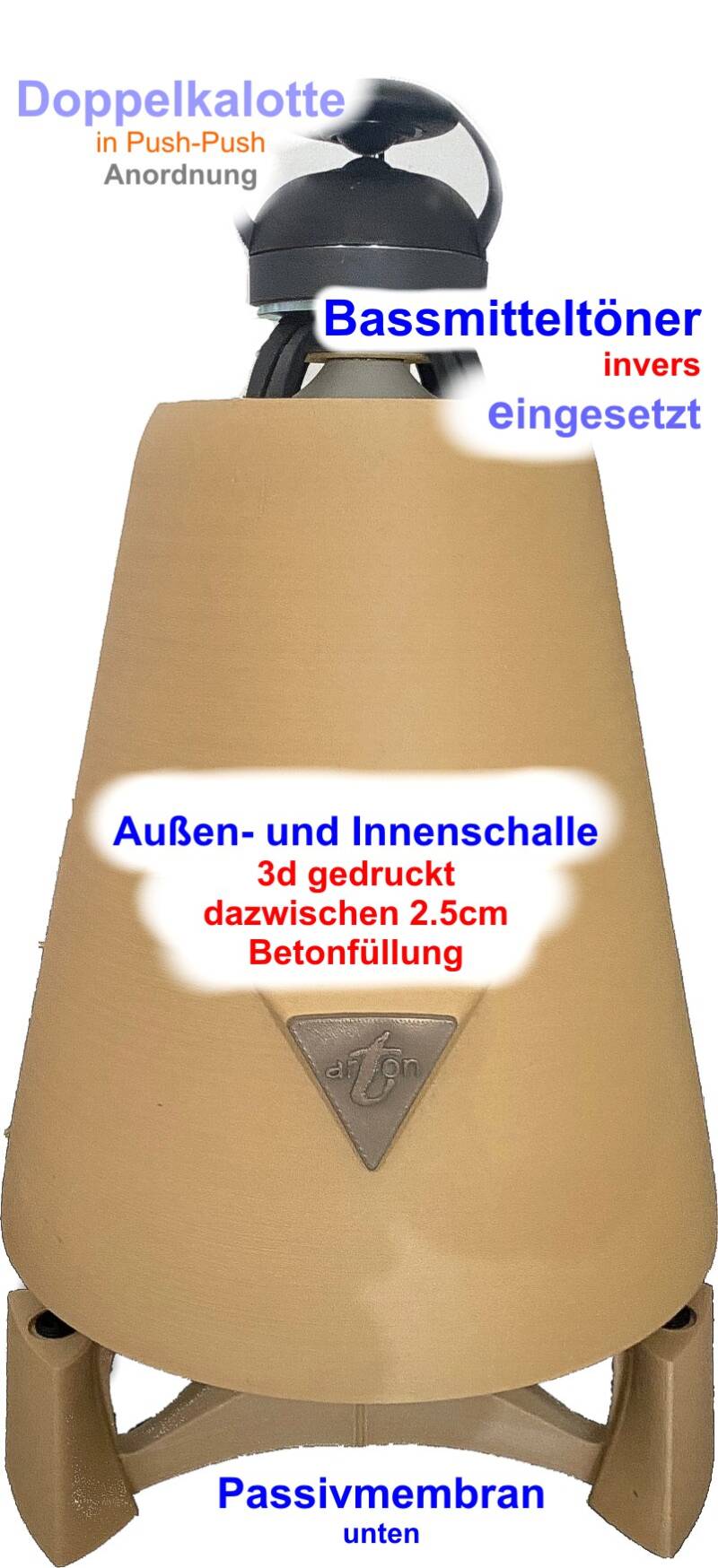Unser Rundstrahlender Lautsprecher wird in 2 Gehäuse Versionen ausgeführt: mit Passivmembran und 15cm BM sowie geschlossen mit 16,5cm bm. Die Hochtoneinheit ist in beiden versionen gleich, und die trennung erfolgt mit 24 db bei 1500 Hz mittels dsp, was gleichzeitg die möglichkeit bietet die raumanpassung durchzuführen.